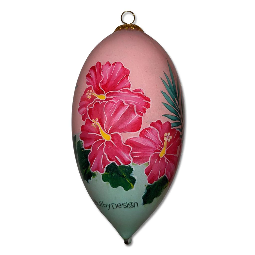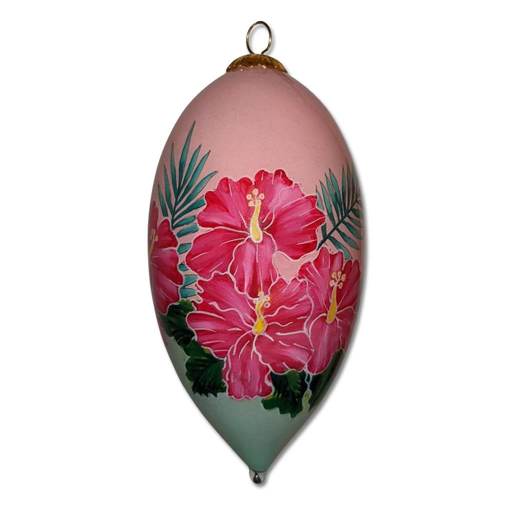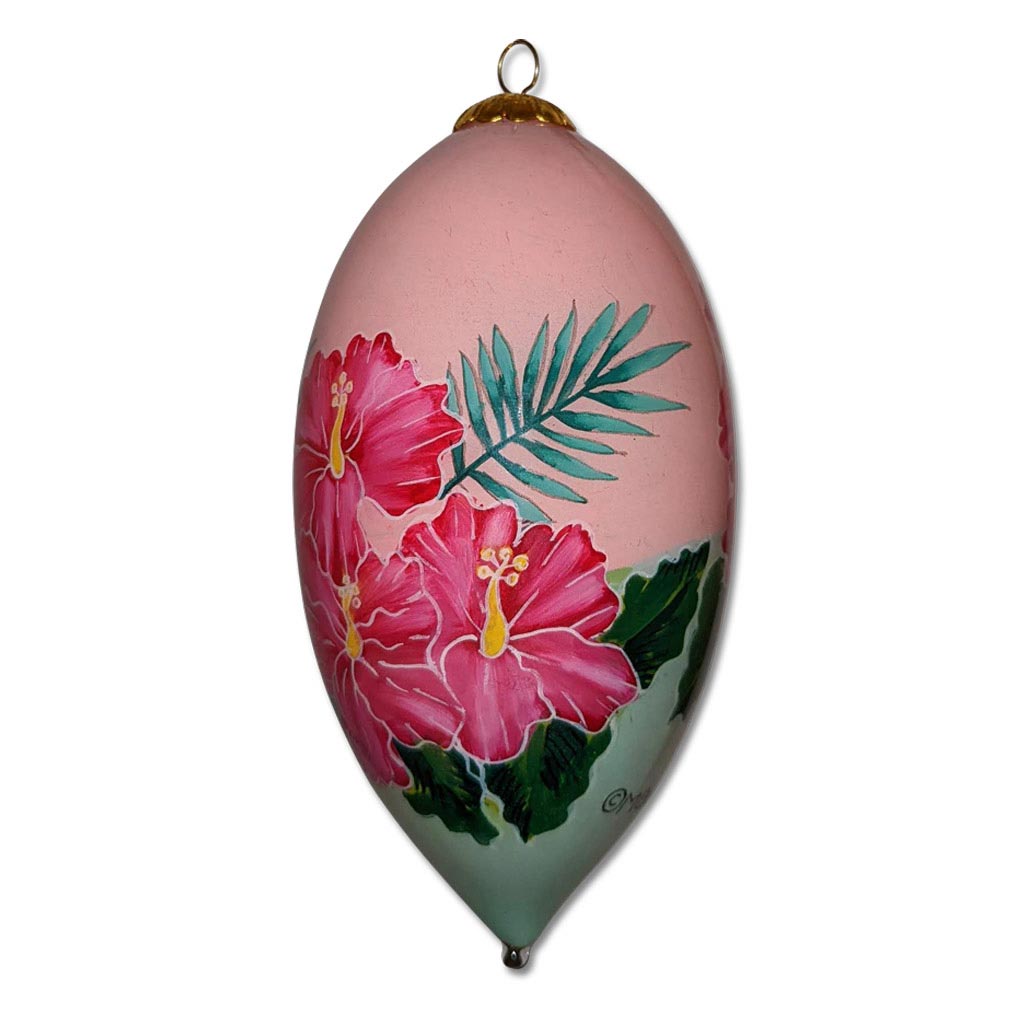 Beautifully detailed Hawaiian pink hibiscus and soft green leaves grace this tear-drop shaped ornament that any tropical flower enthusiasts will love. The entire ornament is composed of varying shades of pink and green, for a very harmonious effect.