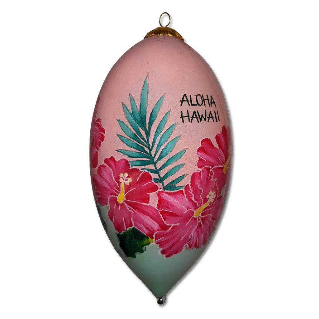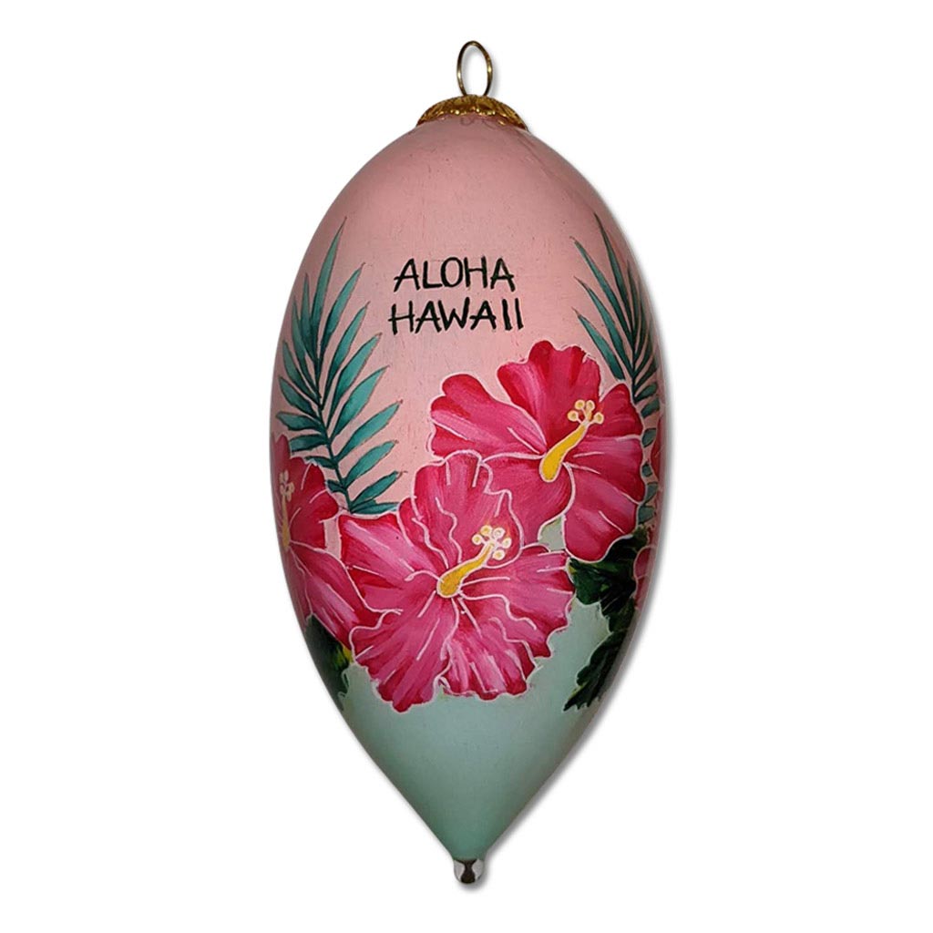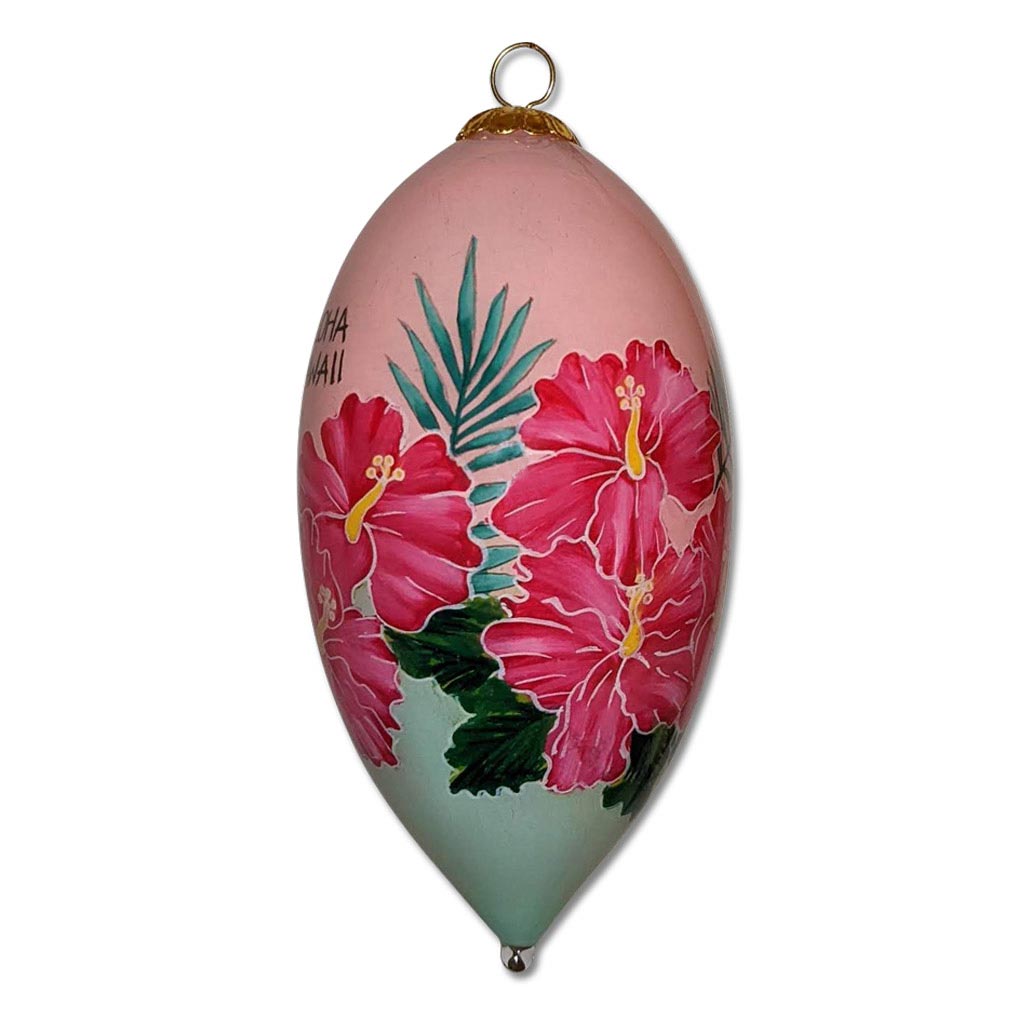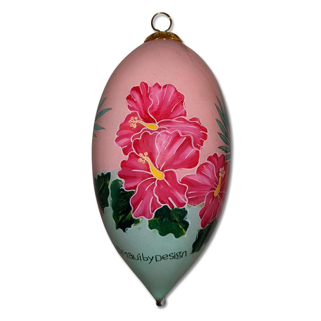 Beautifully detailed Hawaiian pink hibiscus and soft green leaves grace this tear-drop shaped ornament that any tropical flower enthusiasts will love. The entire ornament is composed of varying shades of pink and green, for a very harmonious effect.