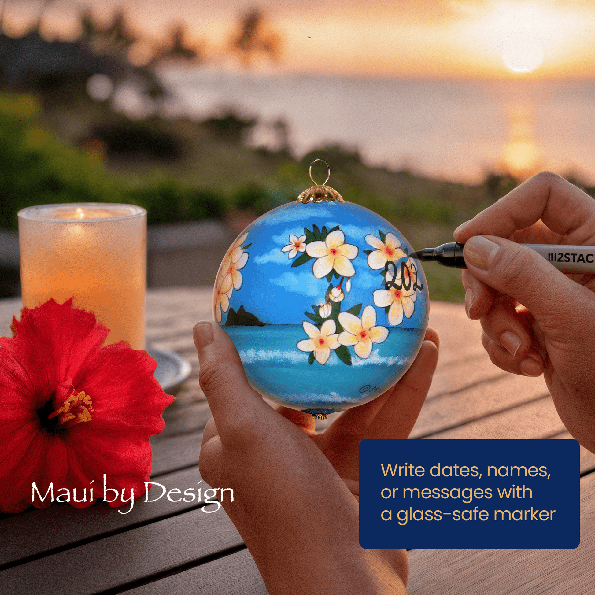 The inspiration for the art on the Hawaiian Plumeria Christmas ornament were some plumeria flowers that had fallen from our tree after a short rain. We transposed the flowers on Hawaii’s stunning ocean and sky to give you a vivid reminder of a relaxed time at the beach, looking out over the ocean.