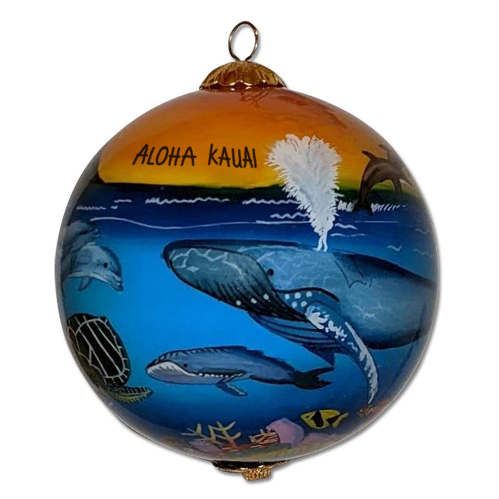 Whichever angle of the ornament you see, there’s lots of interesting detail: an island, the humpback whales blowing water and playing around, the spirited dolphins, and Hawaii’s famous Honu sea turtles.