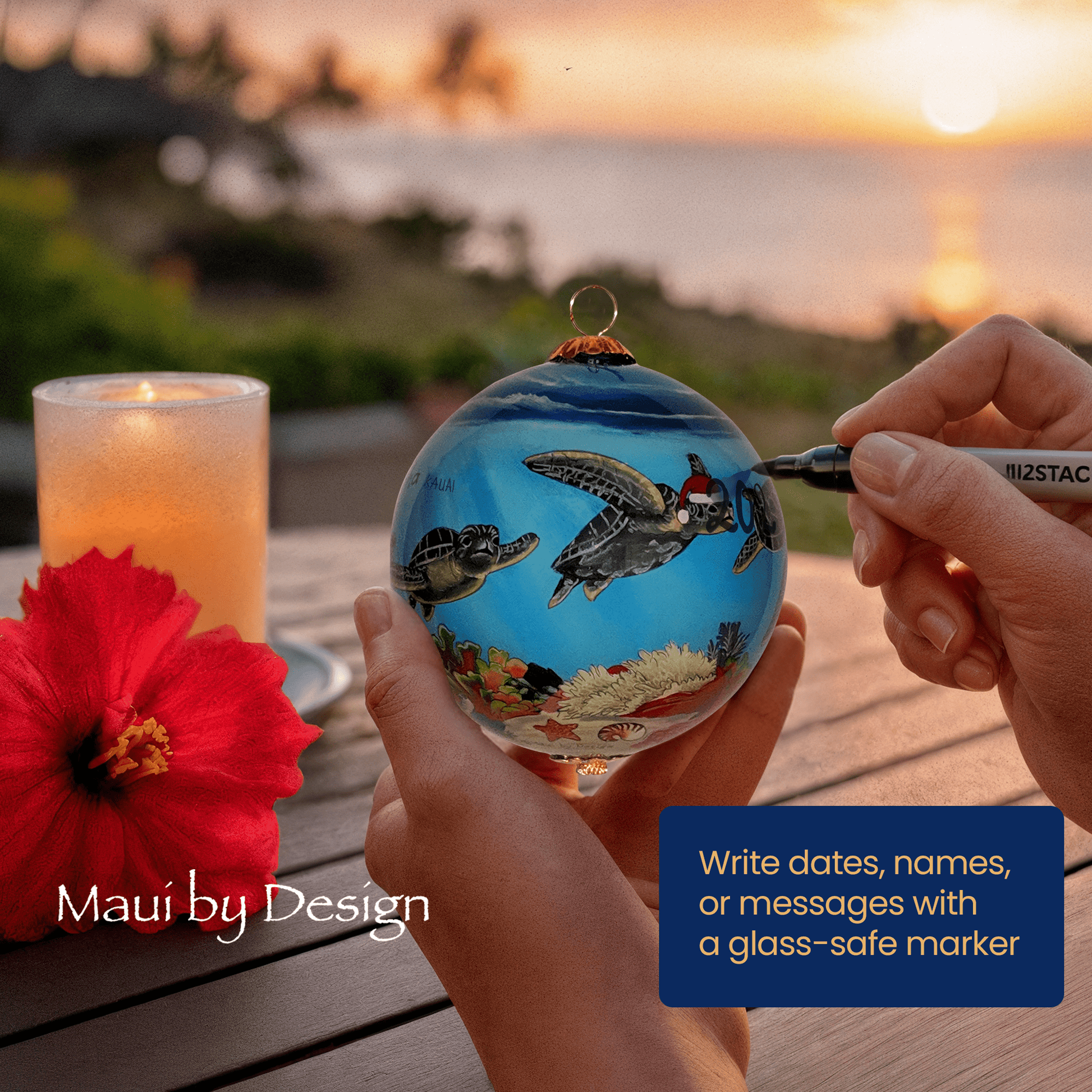 A Hawaiian ornament that features Hawaii’s beloved Honu sea turtles playing Follow the Leader underwater. And did you see that cute turtle wearing the Santa hat?