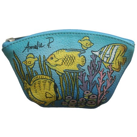 Hand painted leather makes the Tropical Fish coin purse special. Sized perfectly to also fit credit and business cards, fully lined, top zipper entry.