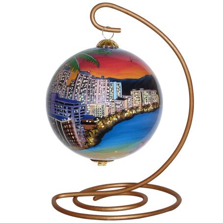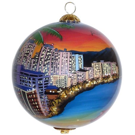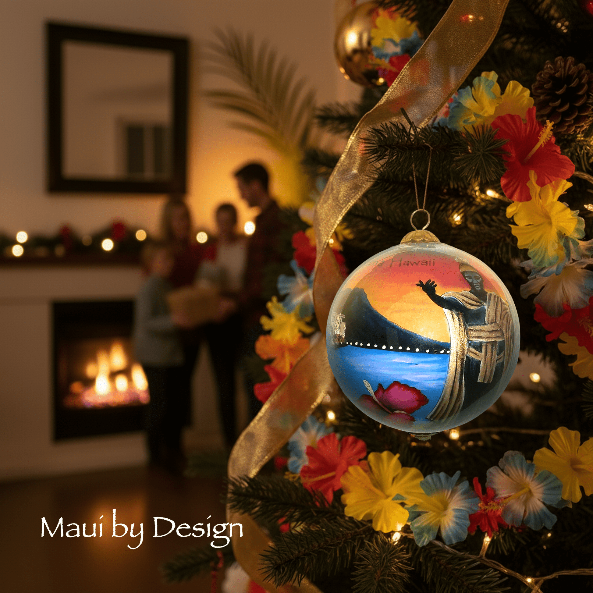 Our collectible glass Hawaiian Christmas ornaments are painstakingly hand painted from the inside of the glass ball. The ornament is 3.2 inches in diameter and comes with a protective and decorative gift box that makes it an ideal Hawaii gift and keepsake for anyone who loves Hawaii.